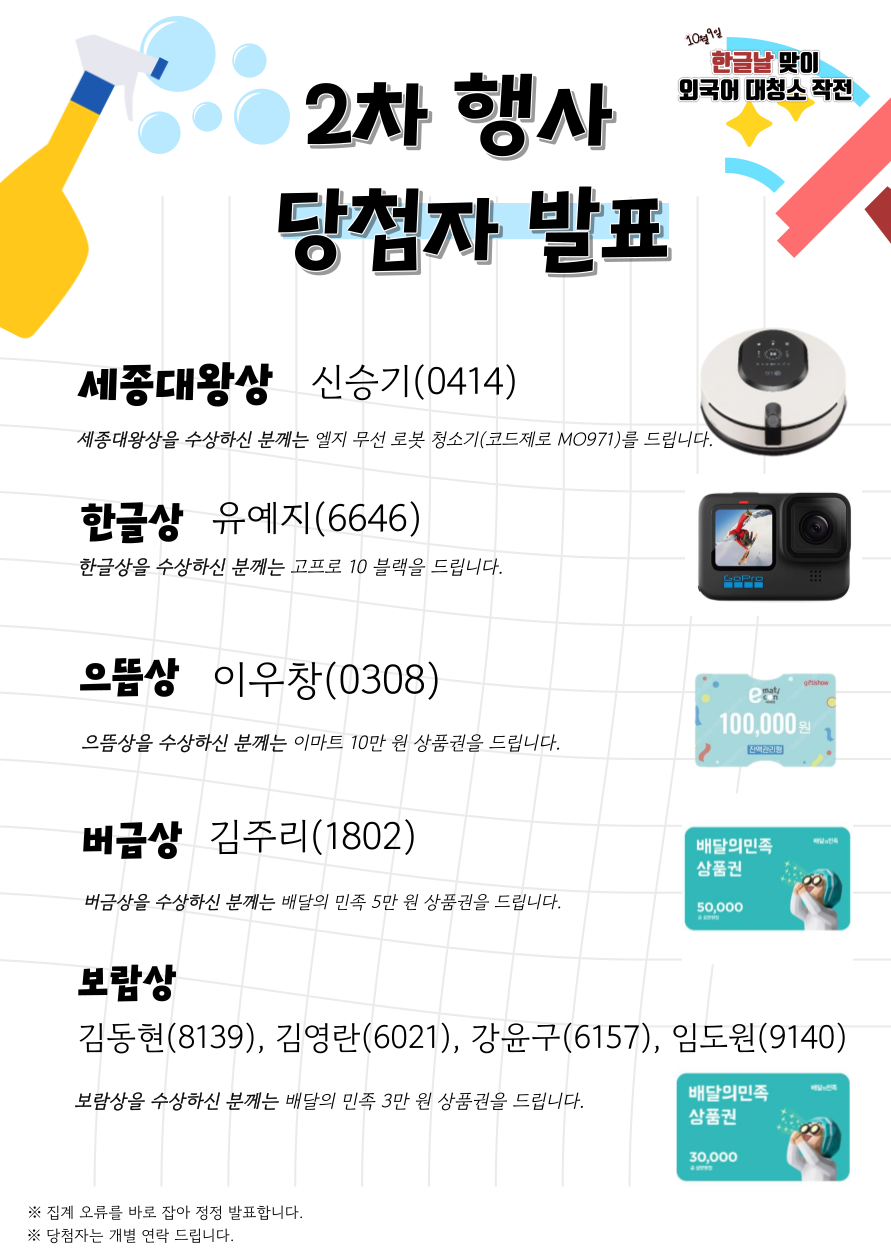 [공지] 한글날 맞이 외국어 대청소 작전 2차 행사 당첨자 및 순위 정정